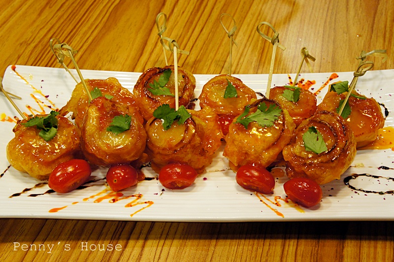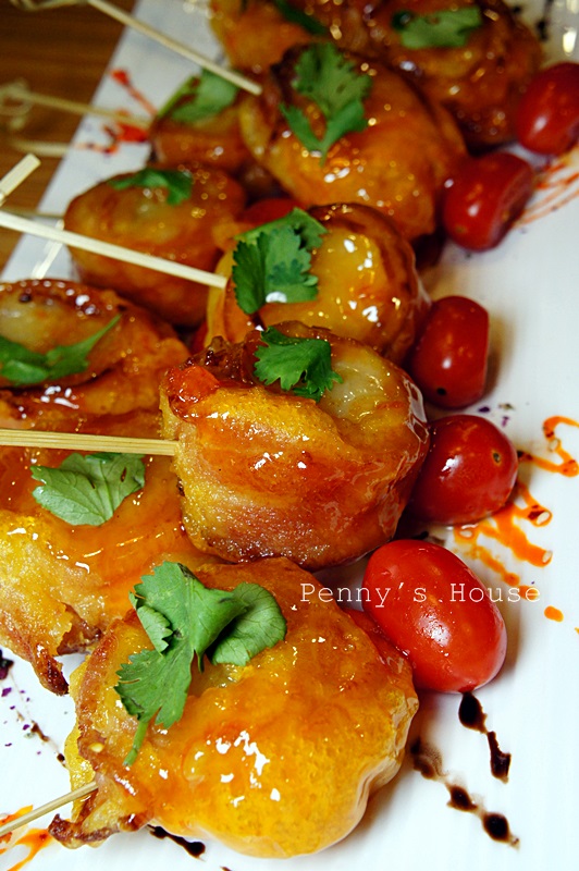 這是由培根包裹甘貝,裹粉酥炸,再沾裹上橙汁糖醋, 這一個可要趁著上桌熱熱的吃掉,因為它外皮的麵衣好薄好酥脆, 我自己吃了三顆ㄟ (誰沒吃?我超愛干貝,很甜~) |