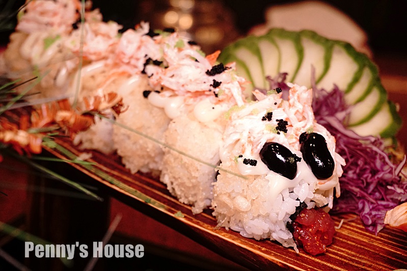 毛毛蟲壽司旁邊一圈沾附了炸天婦羅的麵衣,所以吃起來外麵酥酥脆脆的,