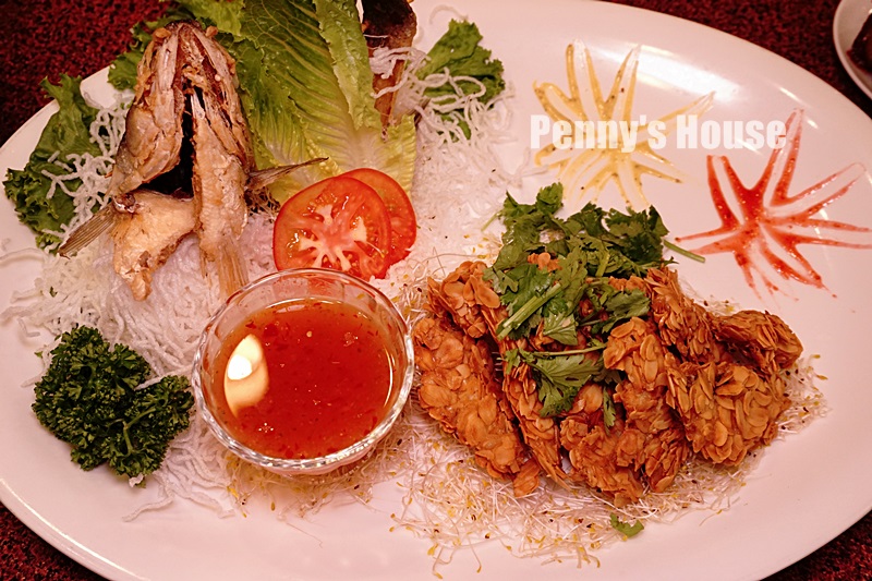 炸蝦捲裡面包了一整支炸蝦,外面用蝦卵點綴。